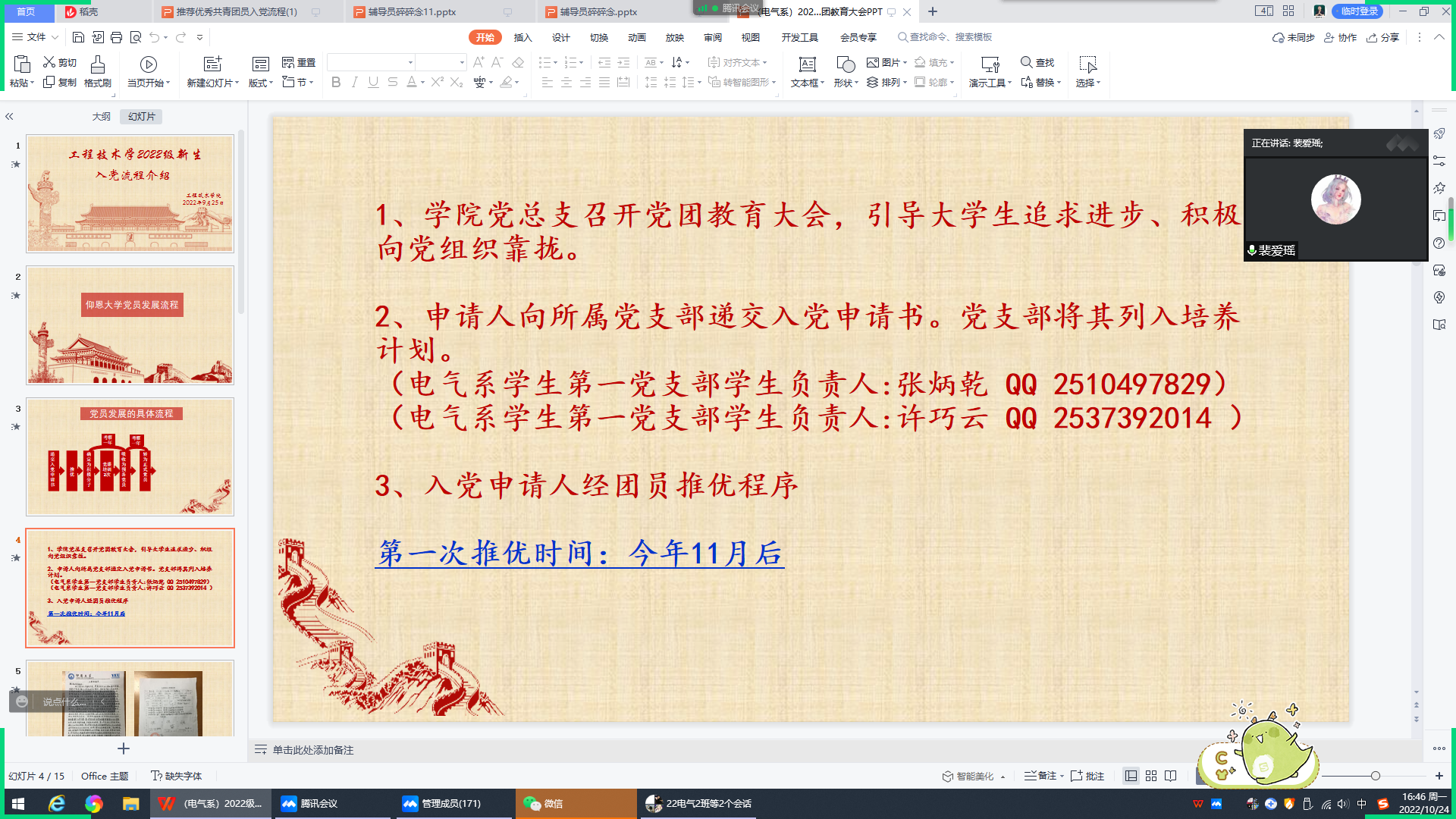 10月24日下午四点,betway西汉姆联官网电气工程及其自动化系学生第一和第二党支部于线上召开2022级新生党团教育大会。此次会议由电气工程系学生第一党支部书记裴爱瑶主持,电气系全体新生参与本次会议。