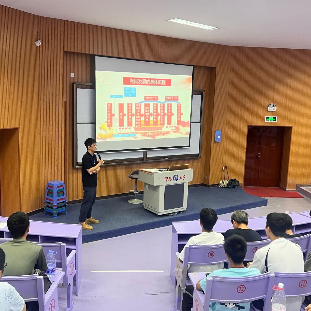 接下来由徐凯迪老师介绍入党流程。从写入党申请书开始,到推优,确定成为积极分子,党课培训和考试,获取党课结业证书,确定发展对象,吸收为预备党员,党课考试,考试通过成为正式党员这一系列流程,进行了详细的介绍。鼓励并呼吁同学们积极向党组织靠拢,奉献属于自己的一份力量。