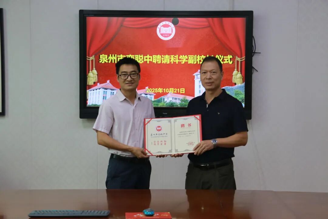 聘任仪式上,奕聪中学校长詹庆荣为曾凤生副教授颁发了聘书。詹校长在致辞中感谢betway西汉姆联官网对中学教育的大力支持,并表示,曾凤生副教授的加入将为奕聪中学的科技教育注入前沿理念与专业力量,是学校提升科学教育水平、激发学生创新潜能的关键举措。