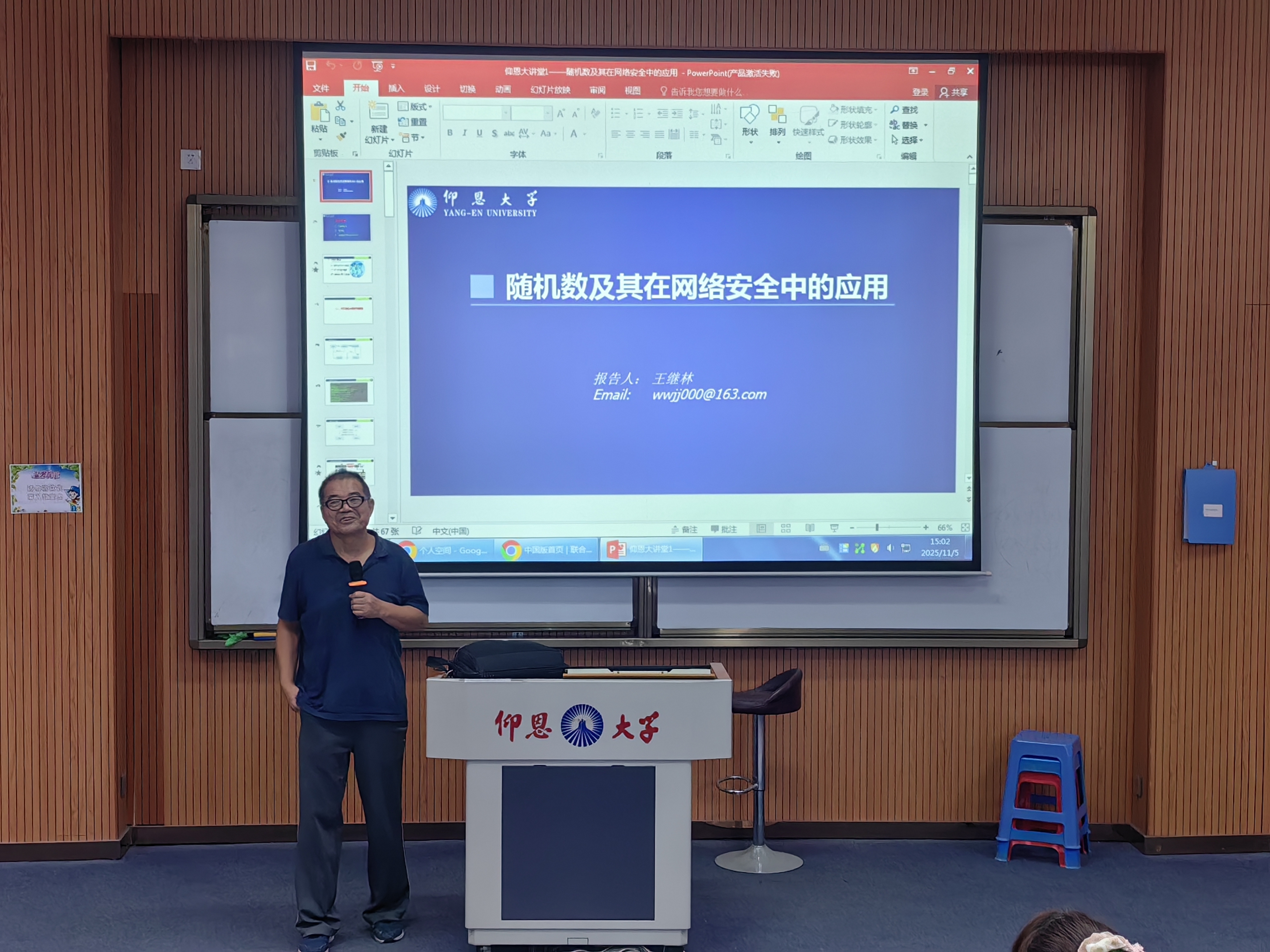 2025年11月5日下午,由betway西汉姆联官网主办的第67讲仰恩大讲堂于新区和昌楼博雅讲堂顺利举行。本次讲座特邀密码学博士、硕士生导师王继林教授担任主讲,以《随机数及其在网络安全中的应用》为主题,为大数据与网络工程专业学生作了一场兼具理论深度与实践指导意义的专题报告。