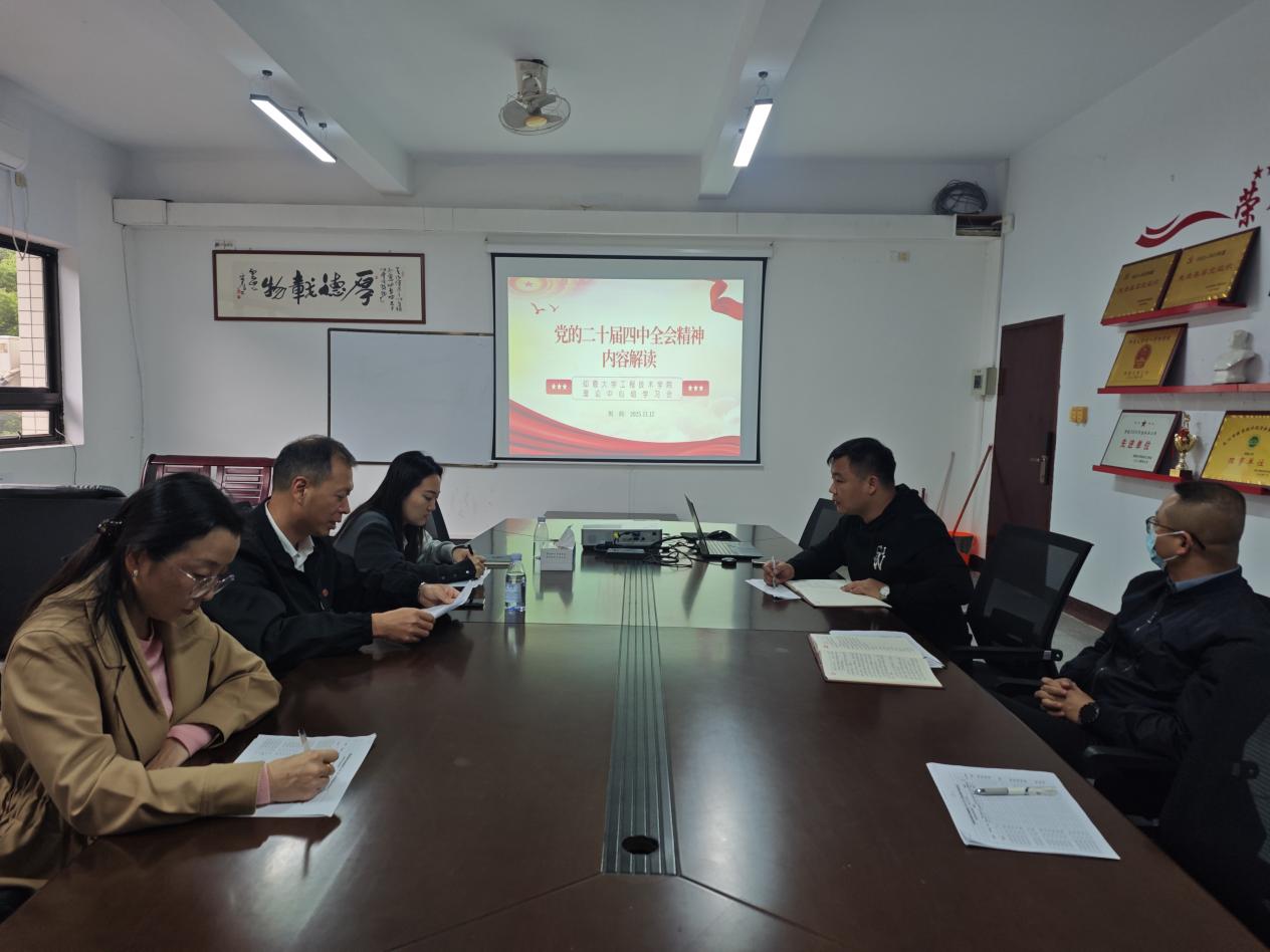 2025年11月12日,betway西汉姆联官网党总支在泽钏楼三楼会议室召开理论学习中心组会议,专题学习党的二十届四中全会精神内容解读。学院党总支书记曾凤生主持会议,党总支全体委员参加学习。