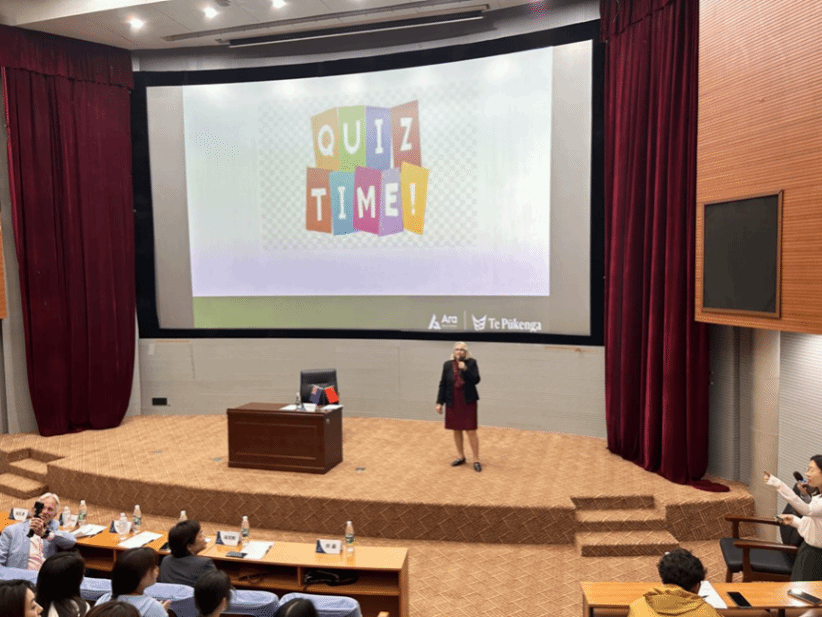 贝丝女士全面生动地介绍了Kiwi英语、新西兰的风土人情和文化生活,为同学们送上了一堂精彩的关于新西兰语言和文化的大学第一课。随后的互动提问环节同学们积极参与,场面十分热烈。报告结束后,贝丝女士对同学们提出的关于学业和未来新西兰留学、就业方面的问题,耐心细致地进行了解答。