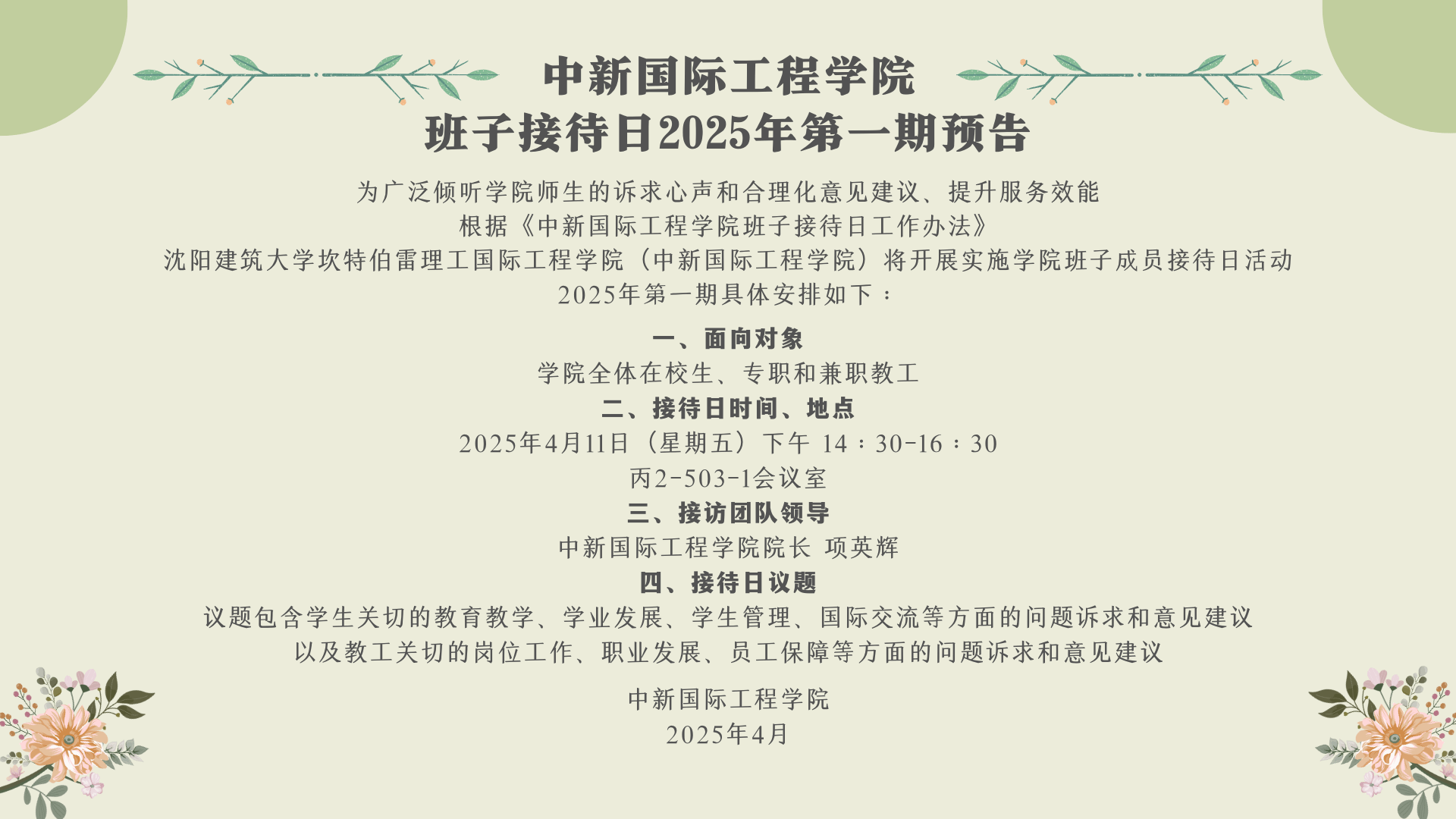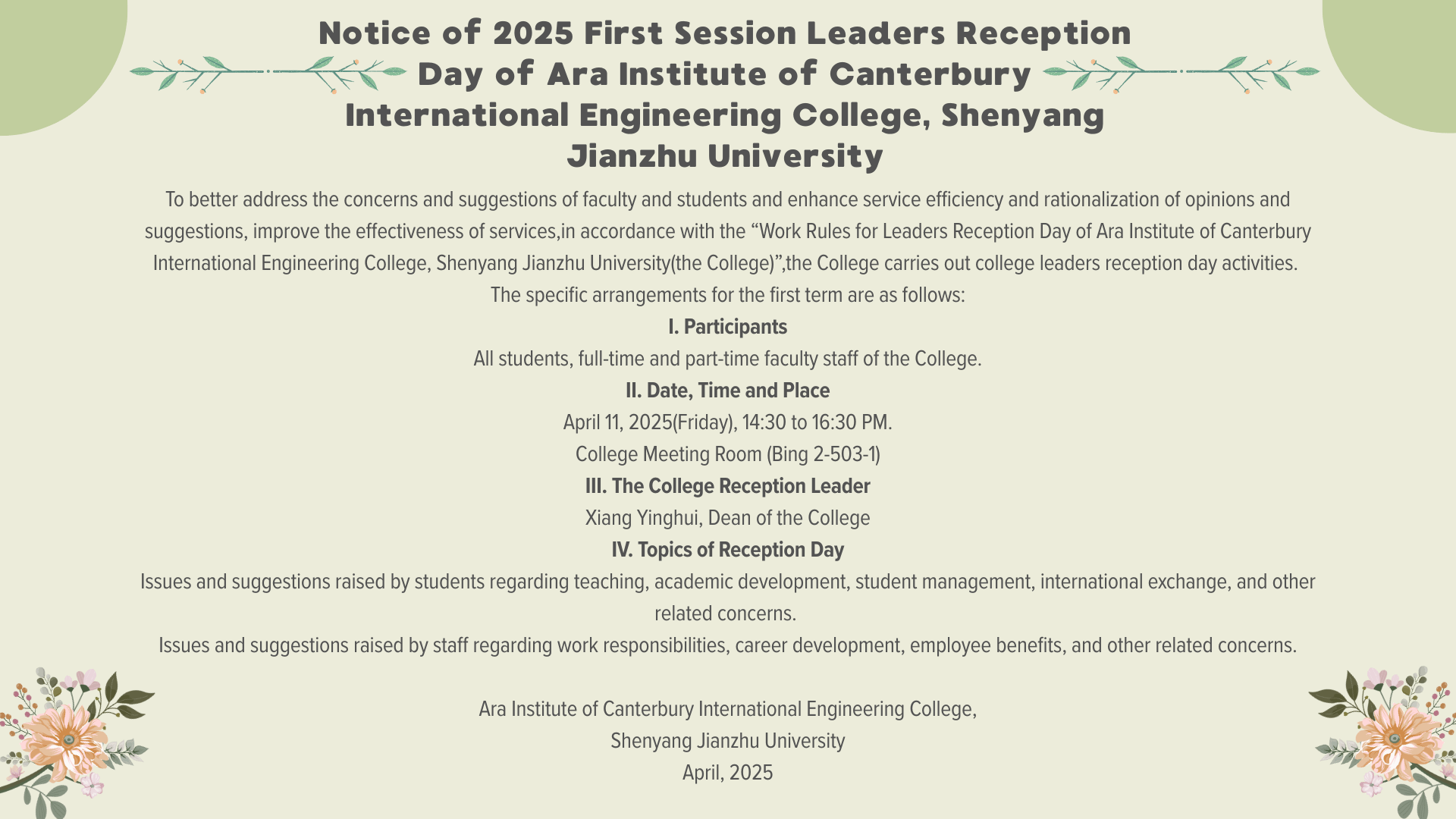 Notice of 2025 First Session Leaders Reception Day of Ara Institute of Canterbury International Engineering College, Shenyang Jianzhu University